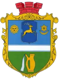 Щит перетятий срібною хвилястою балкою. У першій лазуровій частині скаче золотий олень із срібними рогами й копитами, справа він супроводжується золотим усміхненим шістнадцятипроменевим сонцем, зліва – золотою шестикутною гранованою зіркою, супроводжуваною знизу таким же напівмісяцем ріжками догори. У другій зеленій частині золотий глечик, із якого витікає срібна вода. Щит вписаний у золотий декоративний картуш і увінчаний срібною міською короною.