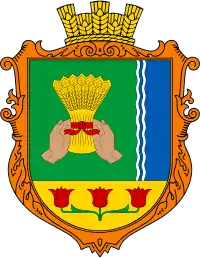У зеленому полі, з двічі хвилясто відділеним синім лівим боком, дві руки, на долонях яких золотий сніп хліба, перев'язаний червоною стрічкою. В золотій основі три червоні тюльпани із зеленими стеблами.