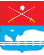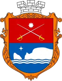 Щит перетятий червоним і синім. У верхньому полі дві срібні шпаги у косий хрест вістрями догори, що супроводжуються вгорі срібною восьмипроменевою зіркою. У нижньому полі над двома срібними хвилястими пониженими нитяними балками стилізовані срібні гора Кішка і скеля Діва, що супроводжуються вгорі срібною чотирьохпроменевою зіркою.