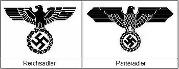 Після того, як Адольф Гітлер прийшов до влади в 1933, орел Веймарської республіки був збережений до 1935 року. НСДАП, яка перебувала при владі, використовувала як свою емблему чорного орла, який тримав у лапах стилізований дубовий вінок, зі свастикою в центрі. Партія використовувала орла, який дивиться на своє ліве плече і, будучи символом нацистської партії, називався Партійний орел (нім. Parteiadler).