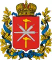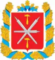 - «У червленому (червоному) щиті срібний клинок меча в пояс, поверх двох таких же перекинутих клинків, покладених у косий хрест. Усі супроводжено вгорі й унизу двома золотими молотками. Щит увінчано золотою імператорською короною й оточено стрічкою ордена Леніна».