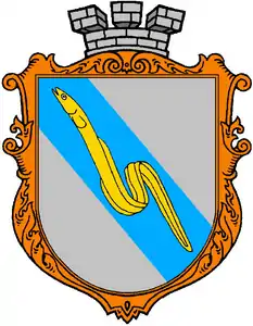 у срібному полі синій перев’яз справа, в якому звивається золотий вугор.