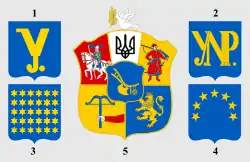 Малий герб складався із золотого тризуба на блакитному щиті. Середній герб містив п'ять регіональних гербів, розміщених на одному щиті, в центрі якого розташовувався малий герб. Регіональними гербами були (1) герб Київщини як символ Наддніпрянської України — срібний архангел Михаїл, що вбиває списом золотого змія, на малиновому тлі; (2) герб Львівщини як символ Галичини — золотий коронований лев на блакитному тлі; (3) герб Буковини і Бессарабії — золота голова бика на червоному тлі, над якою розташовувалася зірка, а по обох боках — місяць і троянда; (4) герб Карпатської України — чорний ведмідь на білому тлі, ліворуч якого три золоті смуги на блакитному тлі; (5) герб Кубані як символ українського козацтва — запорожець у малиновому строї, що стоїть на зеленому острові, з малиновим стягом із білим хрестом, та рушницею.