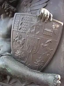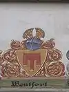 | У срібному щиті червона корогвоа Монфортів з трьома однаково широкими кінцями, чорними смугами з бахромою. Корогва має три червоні кільця на верхньому краї. Верхнє поле банера позначено двома смугами, кінці перекреслені трьома чорними лініями. |