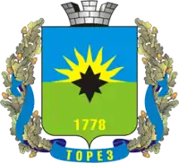 Щит розтятий лазуровим і зеленим. У першій частині золоте сонце, що сходить без обличчя, із золотими променями, прямими й полум'яподібними поперемінно. У другій частині золоті літери «1778». Поверх всього чорна восьмикінцева зірка з довгими й короткими променями поперемінно. Щит обрамлений вінком з дубового листя, перевитого лазуровою стрічкою з написом «Торез», і увінчаний срібною мурованою короною.