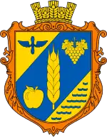 У золотому полі синя ліва перев'язь, на якій золотий колос, супроводжуваний праворуч золотим яблуком, а зліва — золотим виноградним гроном з двома золотими листками. У верхньому полі синя емблема авіації (крилатий гвинт літака), в нижньому полі шість рядів синіх вузьких шипоподібних, що не досягають країв, поясів.