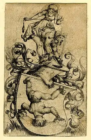 У центральному полі герба подано юнацьку фігуру зі спини, що стоїть на голові. Дослідники розпізнають її як акробата. Звідти назва малюнка і символ світу, де все стоїть догори дригом. Ще незвичнішим є зображення групи на лицарському обладунку. Лайлива жінка, не покидаючи прядіння, їде на спині слабкого за характером і виснаженого від знущань дома чоловіка. Майстер домової книги неодноразово подавав цю групу у власних малюнках і гравюрах. Вона — розповсюджений символ філософа Аристотеля, що потерпав від пані Філліс.
