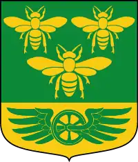 У зеленому полі три золоті бджоли, дві над однією, у золотій основі — зелене колесо з розгорнутими обабіч крилами.