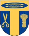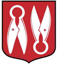 У червоному полі двоє срібних кравецьких ножиць, одні вістрями додолу, інші — вгору.