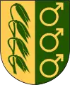 У синьому полі скошені навхрест золоті меч та сокира руків'ями додолу, над ними — такий же алхімічний знак заліза.