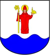 У срібному полі над відділеною хвилясто синьою основою стоїть Святий Сігфрид зі золотим німбом навколо голови, у червоній одежі і тримає в правиці золотий єпископський жезл, а в лівиці — такий же макет храму.