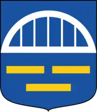 У синьому полі срібний міст, під ним — три золоті тонкі обрізані балки, дві над однією.