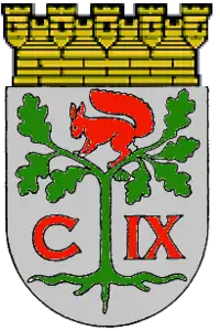 У срібному полі зелений дуб з жолудями і корінням, на якому сидить червона білка, обабіч стовбура — червоні ініціали «С» та «ІХ».
