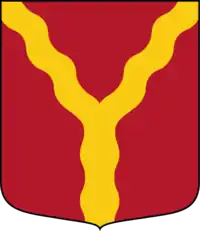 У червонному полі золотий хвилястий вилоподібний хрест.