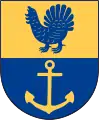 Щит перетятий, у верхньому золотому полі червоний глушець, у нижньому синьому полі — золотий якір.