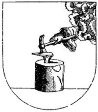 У срібному полі на хвилястій синій основі стоїть праворуч чорне ковадло з червоною базою, з синьої хмари у верхньому лівому куті виходить червона рука з чорним молотком.