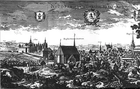Герби на гравюрі з панорамою Нючепінга (біля 1700 р.)