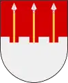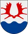 У срібному полі червоні роги лося, вгорі обабіч скошені сині вільні поля.