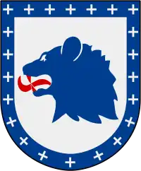 У срібному полі спинається синій ведмідь з червоними зубами, язиком і пазурами, довкола йде усіяний срібними хрестиками синій бордюр.