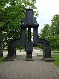 Паровий молот і алхімічні знаки заліза символізують сталеливарну промисловість і металообробку, що сприяли розвитку міста. Оригінальний паровий молот прикрашає тепер міський парк.