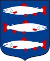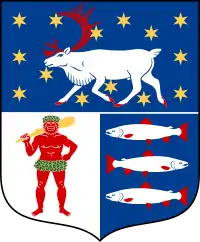 Щит перетятий і напіврозтятий; у 1-у всіяному золотими шестипроменевими зірками синьому полі біжить срібний північний олень із червоними рогами та копитами; у 2-у срібному — червона дика людина з зеленими березовими вінками на голові та на стегнах тримає правицею оперту на плече золоту довбню; у 3-у синьому — три срібні лососі з червоними плавниками і хвостами, один над одним, середній повернутий ліворуч, два інші — праворуч.