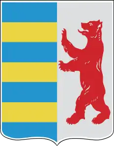 Герб має форму французького геральдичного щита, розділеного по-вертикалі на дві рівні частини. Ліва половина ділиться по горизонталі на сім рівних смуг із чергуванням синього і золотистого (жовтого) кольорів, із яких перша смуга — синя, друга — золотиста. У правій частині щита на срібному (білому) полі — зображення червоного ведмедя, що стоїть на задніх лапах і дивиться ліворуч.