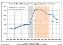 Динаміка населення з 1875 року в сучасних кордонах (Синя лінія: населення; Пунктир: відносна порівняльна динаміка населення землі Бранденбург; Сірий фон: період Третього рейху; Помаранчевий фон: період НДР)