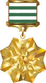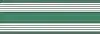 Медаль за допомогою вушка і кільця з'єднується з чотирикутною колодочкою, покритою шовковою муаровою стрічкою. Кольори стрічки чергуються — чотири зелені і три білі горизонтальні смужки.