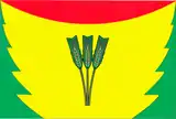 В жовтому прямокутному полотнищі у древковій і кінцевій кромках дві зелені крони напівялинок на всю ширину полотнища, по верхій кромці полотнища проходить червона вигнута смута. В центрі полотнища три зелені колоски з стеблами, які сходяться разом своїми нижніми кінцями. Співвідношення сторін полотнища 2:3 (ширина до довжини); ширина дугоподібної смути складае 1/5 ширини полотнища, довжина основи крони напівялинки у нижній кромці складае 1/4 довжини полотнища; висота колосків складае 3/5 ширини полотнища.