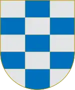 Щит двічі розсічений і чотири рази пересічений на срібло і лазур.