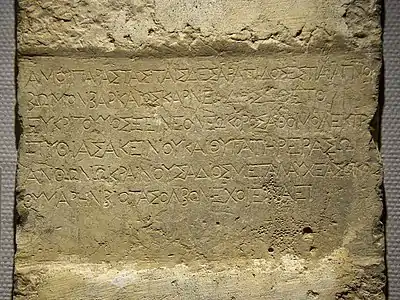 Посвята вівтаря Гестії в Карнеадесі, Таорміна (без дати). Напис говорить: «Поруч із цими стінами Серапіса наглядач храму Карнеад з Барке, син Евкрита, о іноземцю, і його дружина Піфія та його дочка Еразо поставили Гестії чистий вівтар, як нагороду за це, о ти, що керує чудовими оселями Зевсе, даруй їм прекрасне життя»
