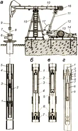 Штангова насосна установка (рис.) складається з поршневого насоса 2, верстата-качалки 15, колони штанг 4, що з'єднують плунжер (поршень) з качалкою, і колони труб (НКТ) 5, по яких відкачувана рідина піднімається на поверхню. Електродвигун 14 служить для приводу в обертання кривошипа 12, встановленого на осі редуктора 13, і далі за допомогою шатуна 11, балансира 10 створює вертикальний зворотно-поступальний рух колони штанг 4, підвішених на головці балансира за допомогою канатної підвіски 9. При ході плунжера вгору нагнітальний клапан 3 закривається, рідина над плунжером піднімається на довжину його ходу і через трійник 6 потрапляє до збірної мережі. Всмоктувальний клапан 1 насоса відкривається, і рідина із свердловини потрапляє в циліндр насоса. При русі плунжера і штанг вниз клапан 1 закривається, вплив стовпа рідини передається на труби. У цьому випадку нагнітальний клапан 3 відкривається і продукція свердловини перетікає в простір над плунжером. Далі починається новий цикл ходу плунжера вгору. Сальник 7 призначений для герметизації гирлової арматури при зворотно-поступальному русі полірованого штока 8, що з'єднує штанги з канатною підвіскою 9. Верстат-качалка урівноважений балансирним 16 і роторним 17 вантажами, які згладжують нерівномірність навантаження верстата.