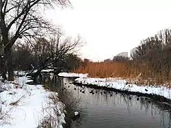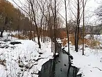 На перетині з вулицею Академіка Павлова і поблизу гирла, на перетині з теплотрасою, струмок тече підземним колектором.