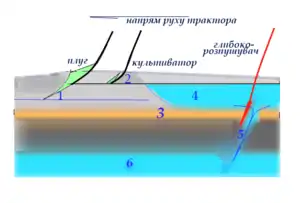 - Ущільнений шар утворюється при тривалому багаторічному застосуванні на полях ґрунтообробної техніки. Техніка своєю масою через колеса чи гусениці постійно «накочує» глиномісткі частки, створюючи щільну кірку на певній глибині. Залежно від щільності і структури ґрунтів він повністю відновлюється за 3-5 років роботи техніки на полях після останнього глибокорозпушення тому радять повторювати процес через 2-3 роки.