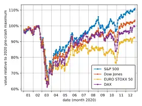 Протягом лютого і березня відбулося кілька великих падінь фінансових індексів по всьому світі. 9, 12 і 16 березня фондові ринки різко впали і тому тричі за березень (в ці дні) доводилося на 15 хвилин призупиняти торги на Нью-Йоркській фондовій біржі[81].