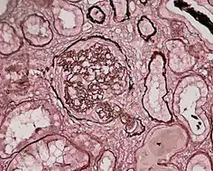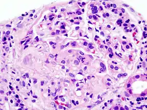 ![]() Мікрофотографія біоптату нирки хворого з гострим прогресивним гломерулонефритом. Фарбування гематоксиліном-еозином. Мікрофотографія біоптату нирки хворого з гострим прогресивним гломерулонефритом. Фарбування гематоксиліном-еозином. | |