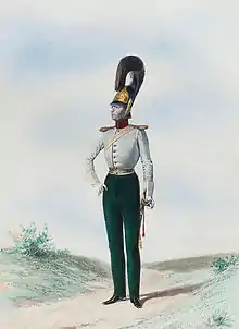 Кірасирські каски, з лакованої шкіри, мали два шкіряні козирки та шкіряний гребінь, у якому фіксувався чорний волосяний плюмаж. Спереду, на касці, кріпився мідний налобник, з гербом. Трубачі мали червоні плюмажі.