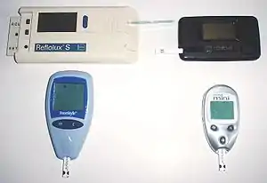 - фотометричні - встановлюють зміну кольору тест-зони, яка виникає внаслідок реакції глюкози з речовиною-реагентом, нанесеною на тест-смужку. Відносяться до апаратів першого покоління.