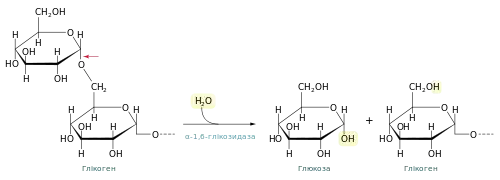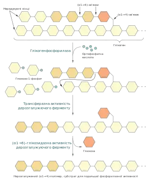 Якщо б гліконефосфорилаза діяла сама, то розщеплення глікогену завершувалось би після вивільнення близько шести залишків глюкози на гілку. Для того, щоб деполімеризувати цілу молекулу потрібні дві додаткові ферментативні активності: трансферазна та α-1,6-глікозидазна, у клітинах еукаріот обидвома активностями володіє один так званий дерозгалужуючий фермент. Спершу він каталізує перенесення фрагменту із трьох глюкозних залишків із зовнішньої гілки на внутрішню. Після цього залишається один глюкозний мономер приєднаний (α1→6)-глікозидним зв'язком, який гідролізується завдяки α-1,6-глікозидазній активності[6][4]:
