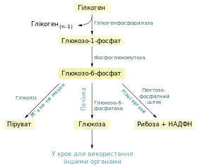 Продукт глікогенолізу глюкозо-6-фосфат може перетворюватись трьома шляхами: він може бути субстратом для гліолізу (переважно у м'язах та мозку), перетворюватись у вільну глюкозу і поступати в кров (у печінці, і, меншою мірою, в нирках) або перетворюватись у пентозофосфатному шляху із утворенням рибози та НАДФH.
