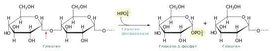 На відміну від процесу перетравлення глікогену внутрішньоклітинний глікогеноліз відбувається шляхом фосфоролізу, а не гідролізу. Тобто глікозидні зв'язки полімеру атакуються не водою, а фосфатною кислотою. Відповідно продуктом реакції є не вільна глюкоза, а глюкозо-1-фосфат. Утворення естеру дозволяє зберегти велику частину енергії глікозидних зв'язків і для включення моносахариду у метаболічні шляхи, такі як гліколіз та пентозофосфатний шлях не потрібно їх додатково фосфорилювати, на що витрачалась би молекула АТФ. Крім того утворення глюкозо-1-фосфату у м'язах має ще одну перевагу: ця сполука негативно заряджена за фізіологічних умов і для неї, на відміну від глюкози, нема переносників у плазматичній мембрані, тому вона не може покидати клітину[1][2].
