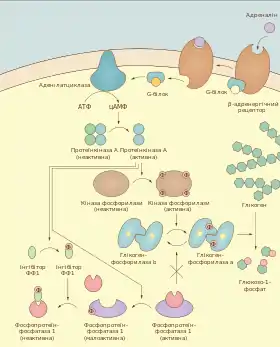 Як у м'язах, так і в печінці глікогенфосфорилаза активується внаслідок фосфорилювання. Фосфорильовану її форму називають фосфорилазою a, а не фосфорильовану (і, відповідно, неактивну) — фосфорилазою b. Перетворення b форми в a забезпечує кіназа фосфорилази. Вона у свою чергу також є регуляторним ферментом і може активуватись під впливом фосфорилювання або/і підвищеної концентрації кальцію в цитоплазмі. Фосфорилює кіназу фосфорилази протеїнкіназа А, яка функціонує тільки за наявності певного рівня цАМФ. Збільшення концентрації вторинного посередника цАМФ у клітині відбувається під дією гормонів, глюкагону та адреналіну (коли він зв'язується із β-адренергічним рецептором)[13][14].