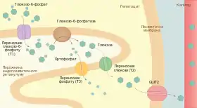 Зі всіх тканин організму тільки печінка та нирки містять фермент глюкозо-6-фосфатазу, він необхідний для поповнення рівня глюкози в крові у період між прийомами їжі або інтенсивного фізичного навантаження. Глюкозо-6-фосфатаза — інтегральний фермент мембрани ендоплазматичного ретикулуму із активним центром повернутим в його порожнину. Глюкозо-6-фосфат, що утворюється у цитоплазмі в процесі глікогенолізу, транспортується спеціальним переносником (T1) в ЕР, де відбувається його гідроліз. Продукти — глюкоза та фосфат — транспортуються назад у цитозоль іншими білками — T2 та T3, а звідти за участі переносника GLUT2 глюкоза виділяється у кров[4][8].