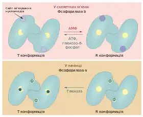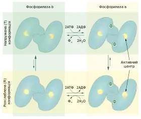 Існує дві форми глікогенфосфорилази, що перетворюються одна в одну: переважно активна (фосфорильована) фосфорилаза a та переважно неактивна (нефосфорильована) фосфорилаза b. Кожна із цих форм у свою чергу може перебувати в одній із двох конформацій: каталітично активній розслабленій R (від англ. relaxed) та каталітично неактивній напруженій T (від англ. tense). Для фосфорилази a рівновага зміщена в сторону переходу в R-стан, тоді як більшість фосфорилази b перебуває у T-стані[13].