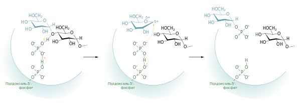 Можливий такий механізм реакції: ортофосфат (у формі HPO2-4) донує протон атому Оксигену, що утворює (α1→4)-зв'язок, і одночасно набуває протона від фосфатної групи ПЛФ. Таким чином формується перехідна сполука карбоній-оксоній катіон у конформації півкірсла. Він атакується ортофосфатом, внаслідок чого відбувається утворення глюкозо-1-фосфату та повернення протона до ПЛФ[8][5][9].