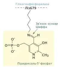 По-друге для протікання реакції фосфоролізу необхідна присутність кофактора піридоксаль-5'-фосфату (ПЛФ) (похідного вітаміну B6), приєднаного до Ліз679 через формування основи Шиффа. Структурний аналіз показав, що ортофосфат займає положення між 5'-фосфатною групою ПЛФ та глікогеном. 5'-фосфатна група ПЛФ може відігравати роль загального кислотно-основного каталізатора, спочатку донуючи протон, а потім перетворюючись у його акцептор[5].