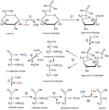 Гліко́ліз або шлях Ембдена—Меєргофа—Парнаса (від дав.-гр. γλυκός — солодкий та λύσης — розщеплення) — ланцюг з 11 реакцій, внаслідок яких глюкоза C6H12O6 перетворюється на піруват, C3H3O-3 з утворенням АТФ (аденозинтрифосфату) та НАДН (відновленого нікотинамідаденіндинуклеотиду).