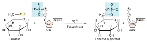 Перша реакція гліколізу — фосфорилювання глюкози з утворенням глюкозо-6-фосфату, що каталізується ферментом гексокіназою. Донором фосфатної групи є молекула АТФ. Реакція відбувається тільки за наявності іонів Mg2+, тому що справжнім субстратом для гексокінази є не АТФ4-, а комплекс MgАТФ2-. Магній екранує негативний заряд фосфатної групи, таким чином полегшуючи здійснення нуклеофільної атаки на останній атом фосфору гідроксильною групою глюкози[18].