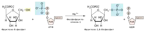 Після стадії ізомеризації починається друга реакція фосфорилювання, за якої фруктозо-6-фосфат перетворюється на фруктозо-1,6-бісфосфат завдяки приєднанню фосфатної групи АТФ. Реакцію каталізує фермент фосфофруктокіназа-1 (скорочено ФФК-1). Існує також фермент ФФК-2, який каталізує утворення фруктозо-2,6-бісфосфату іншим метаболічним шляхом [21].