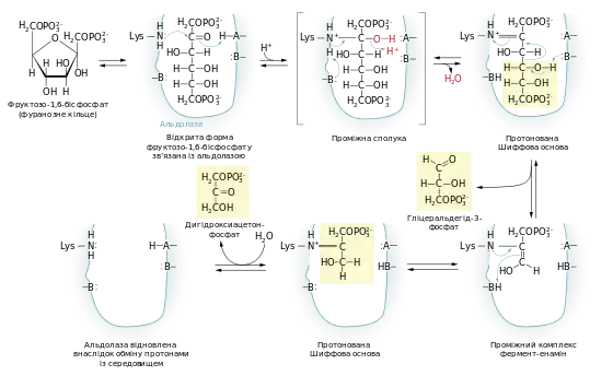 Фруктозо-1,6-бісфосфат розщеплюється до двох фосфотріоз: гліцеральдегід-3-фосфат та дигідроксиацетонфосфат під впливом фруктозо-1,6-фосфатальдолази (частіше просто альдолаза). Назва ферменту альдолази походить від зворотної реакції альдольної конденсації[22]. Механізм проходження реакції зображений на схемі: